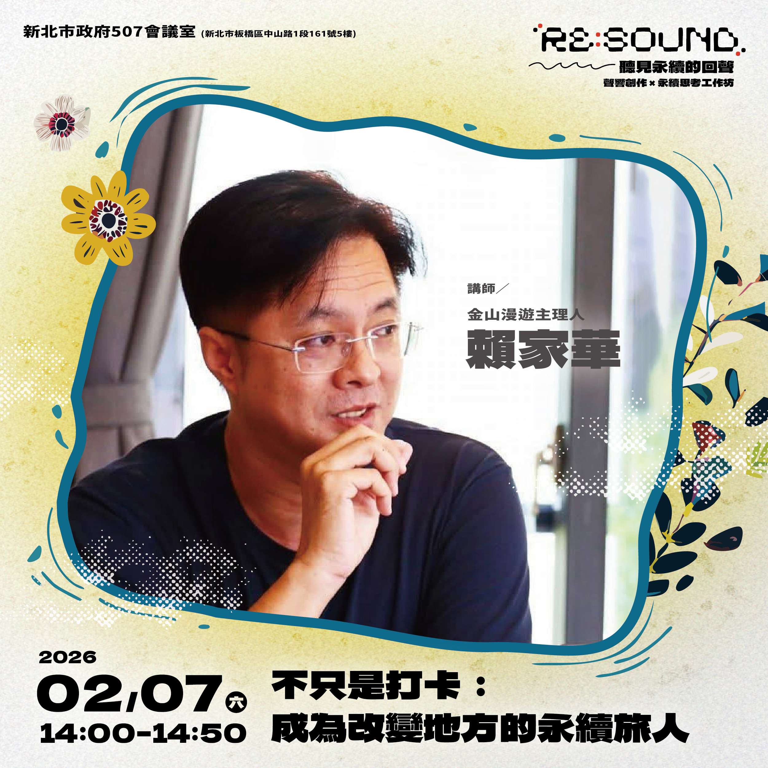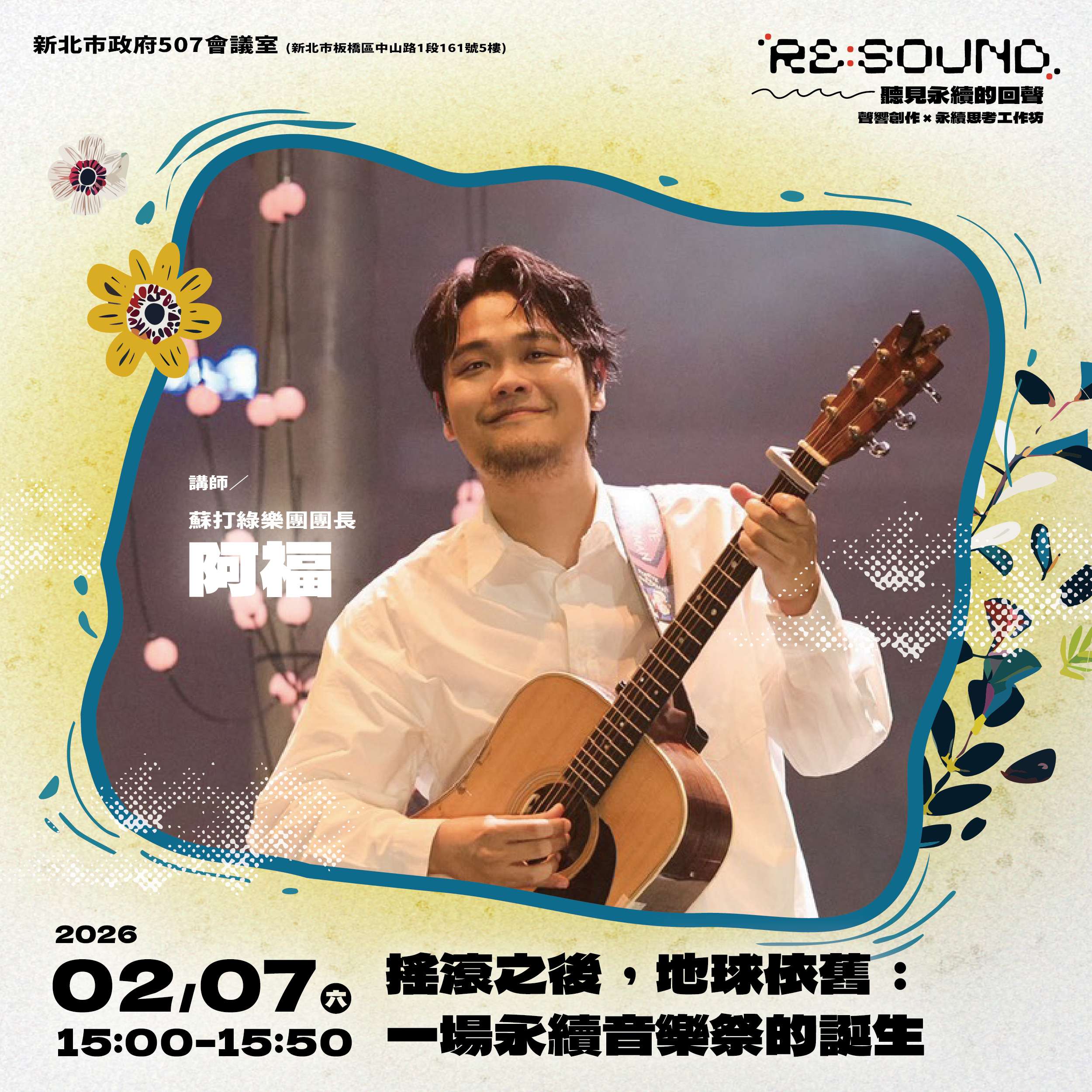 為增進青年學生對永續議題之認識與實踐,本局與新北市文化基金會合作辦理「RE: SOUND|聽見永續的回聲—聲響創作 × 永續思考工作坊」,其中2月7日下午場次邀請「蘇打綠」樂團團長阿福(何景揚)及「金山漫遊」主理人賴家華擔任講師,分享永續音樂節與永續旅遊。
