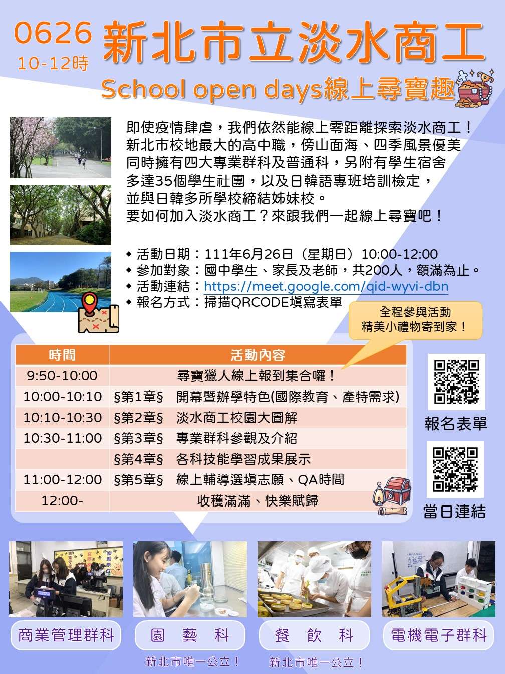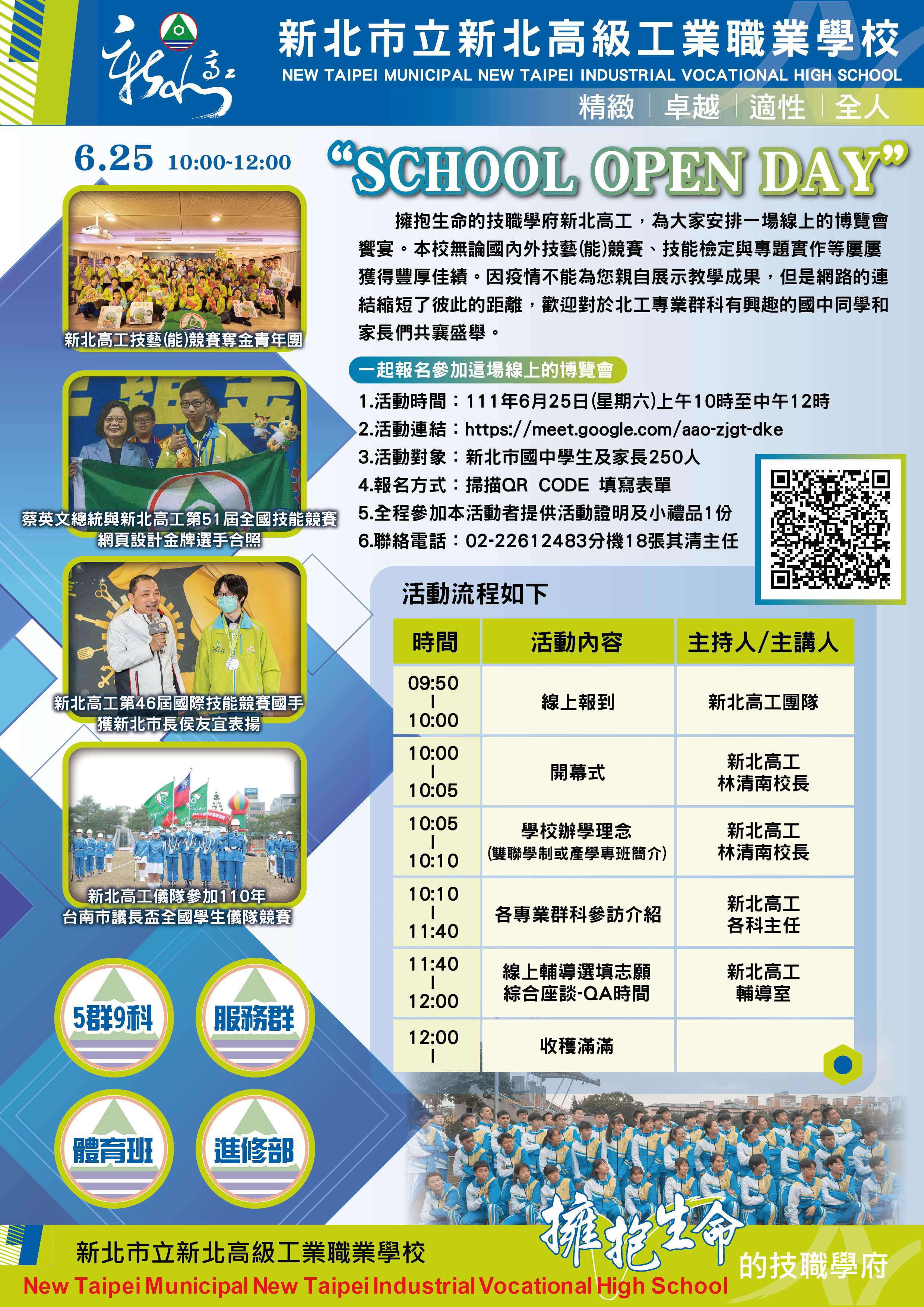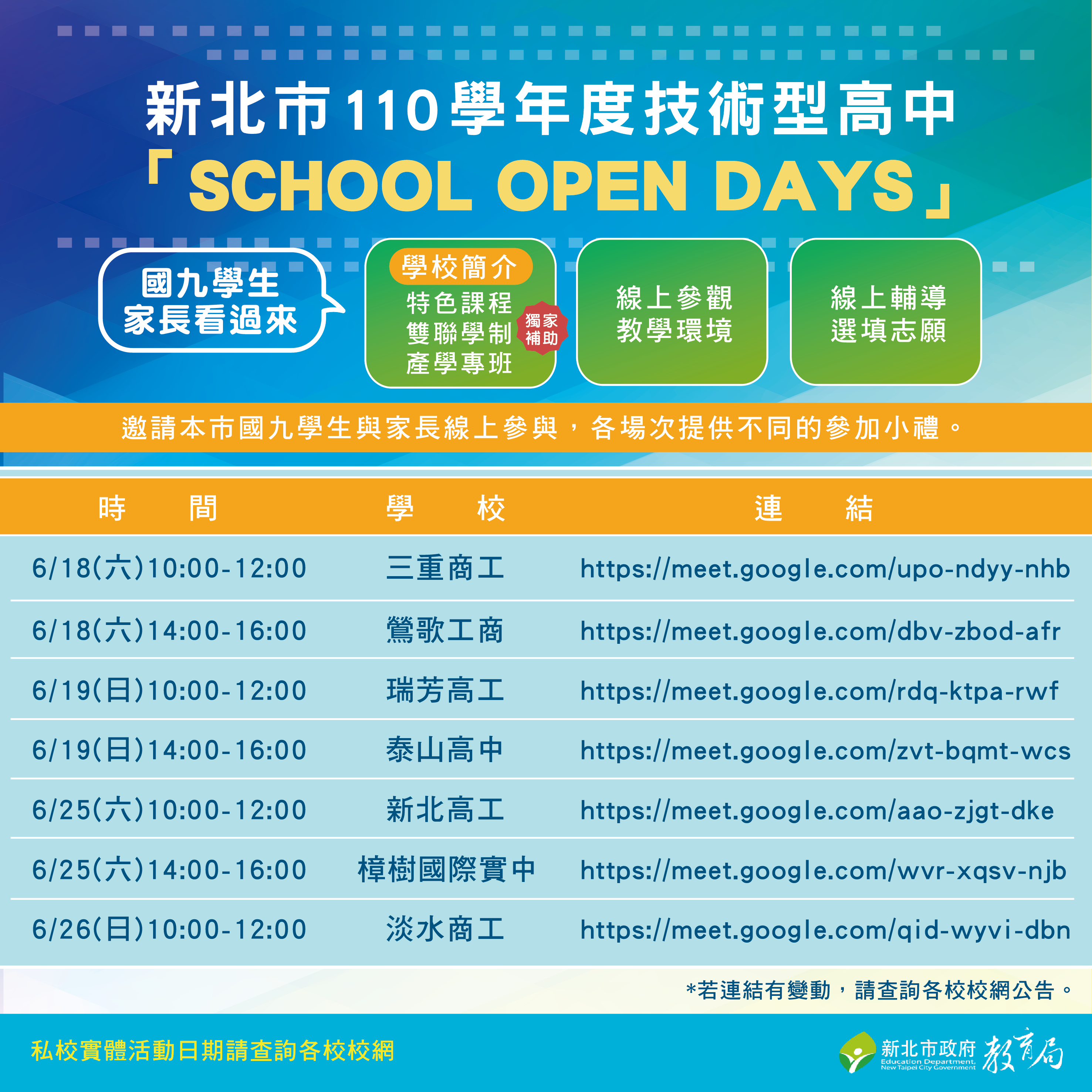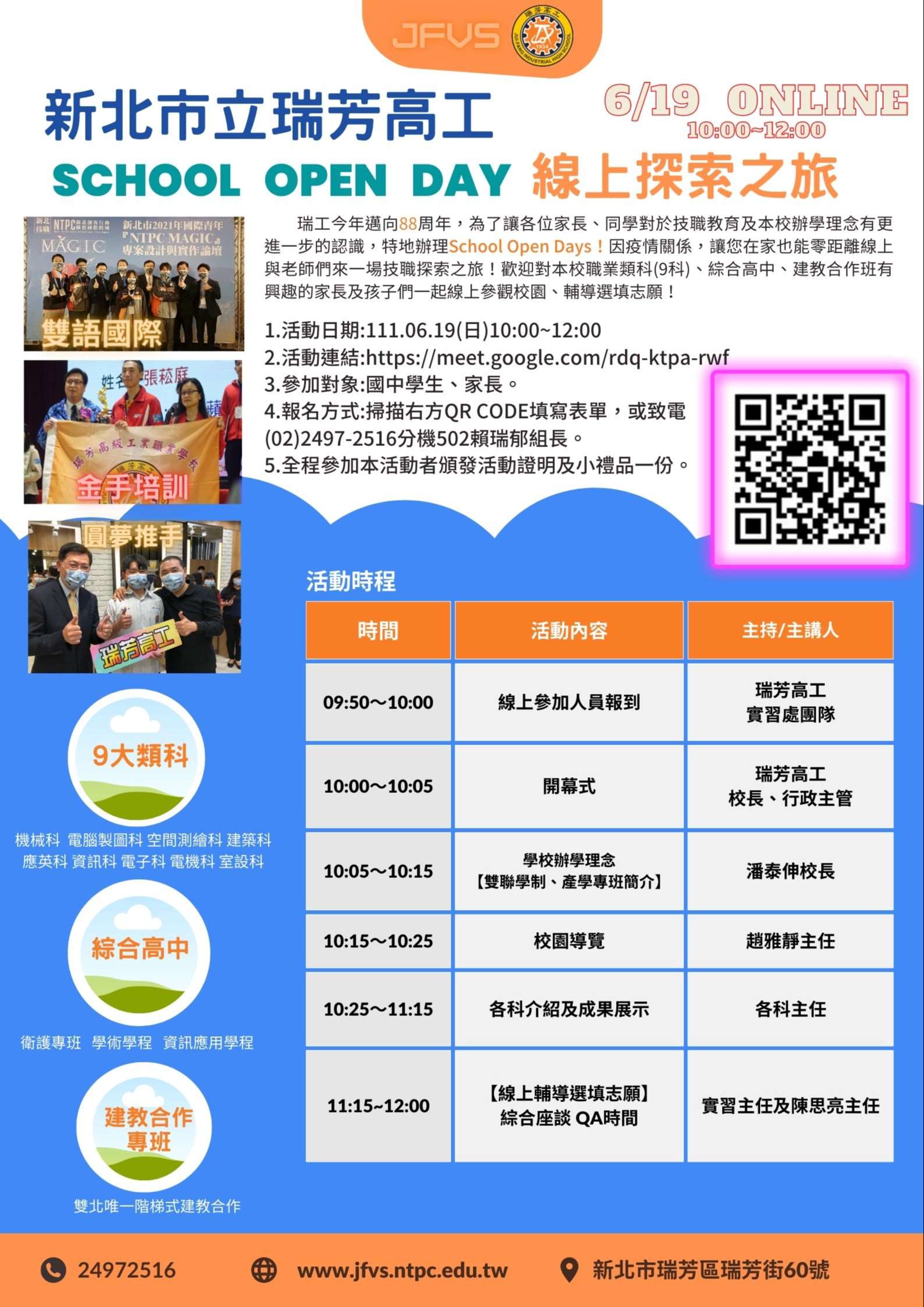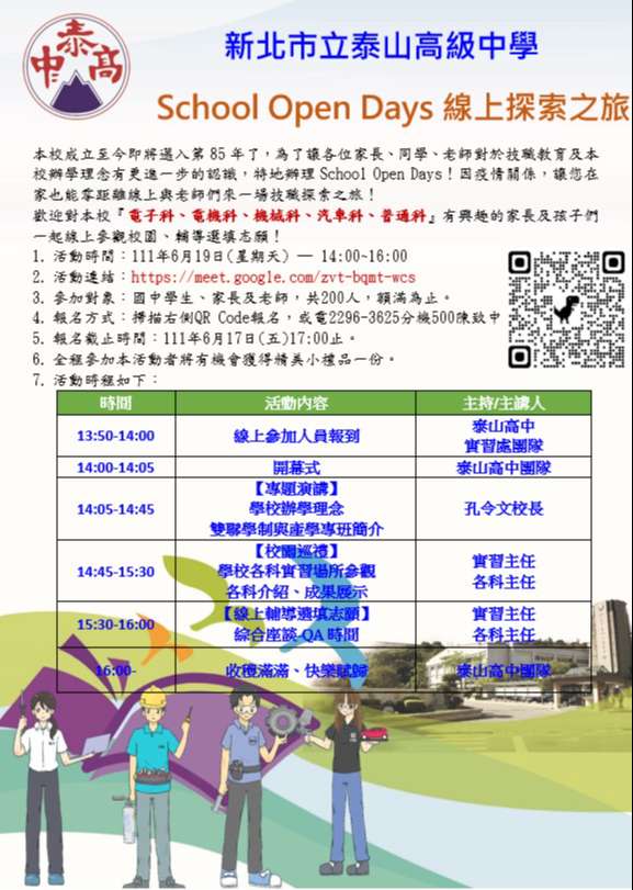 二、為讓家長及學生了解本巿技術型高中學校的特色、教學環境與課程,協助國中生會考成績公告後適性選填志願,安排本市7所公立技高於6月18、19、25、26日上午10至12時、下午2至4時,進行線上校園巡禮並提供志願選填服務(各校時間如附件,亦可至該校網站查詢),線上名額有限,請務必記下時間提早上線。