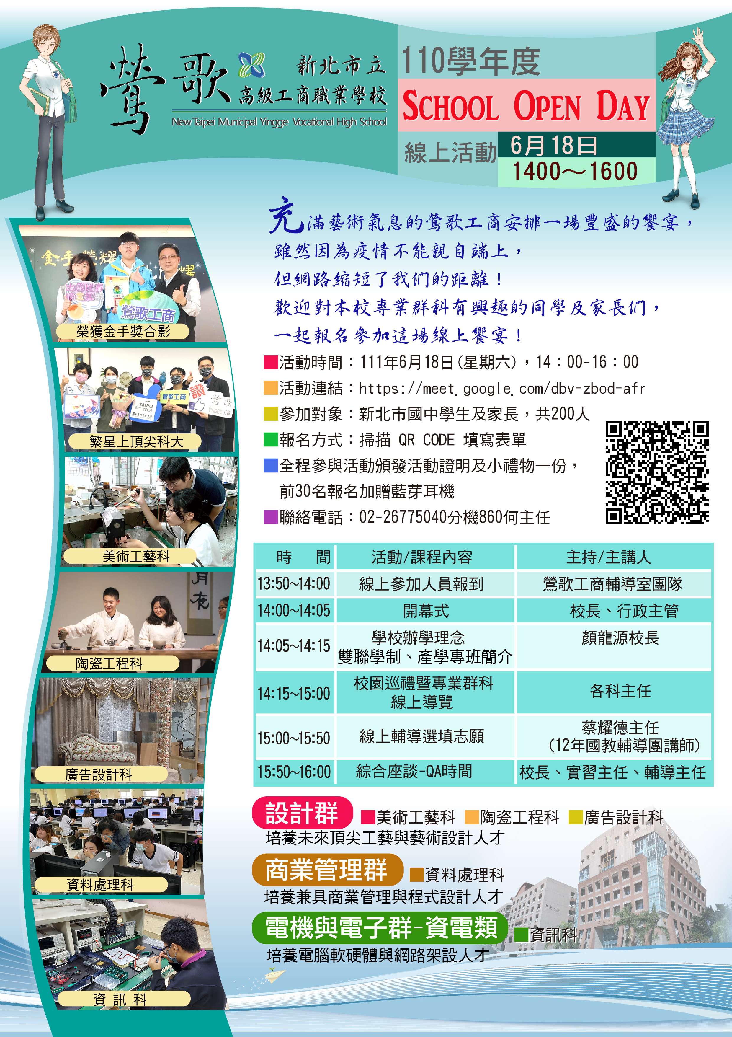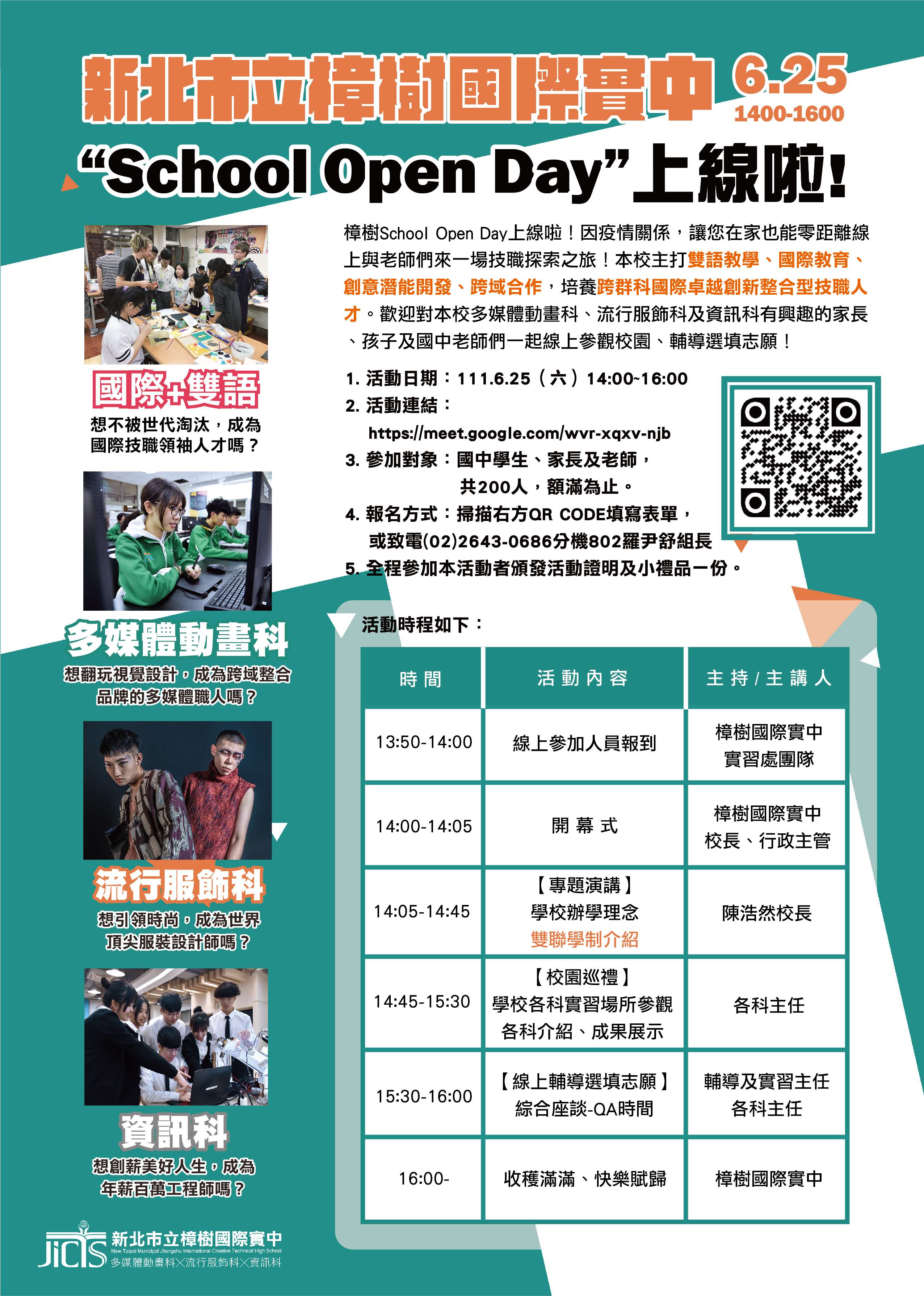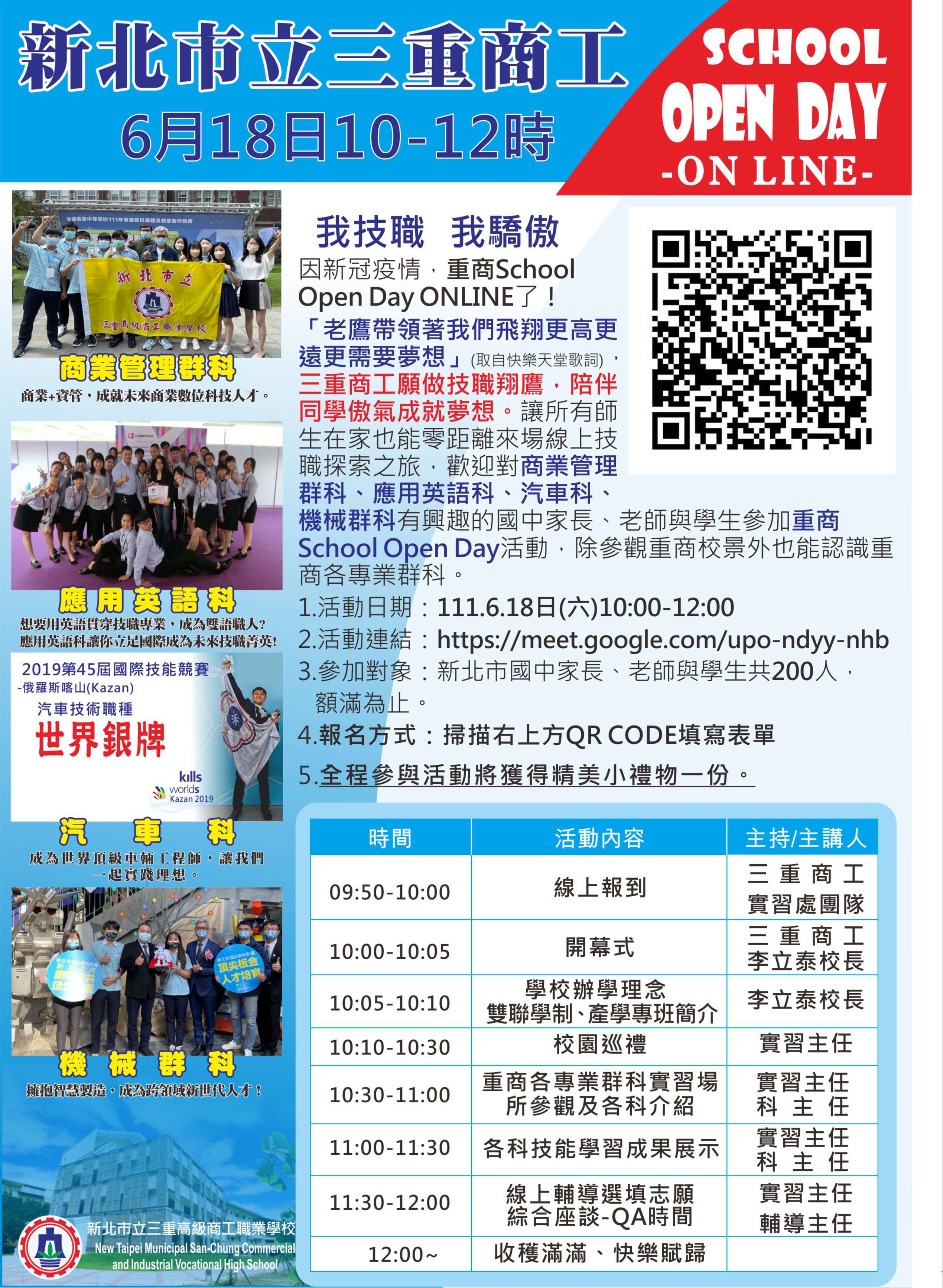 一、以往會考後九年級學生在校皆安排多元試探及參訪機會,因應疫情多數學生採線上授課,無法適性探索自己的未來,然此時是所有九年級學生升學關鍵時刻,未來選擇技術型高中還是普通型高中,資訊科還是資處科等問題,為了讓學生皆能適性選擇,特別邀請本市公私立技術型高中辦理線上或實體參訪及體驗活動。請各校務必轉達各班導師、輔導活動科教師及每位九年級學生及家長,積極協助學生未來生涯選擇。