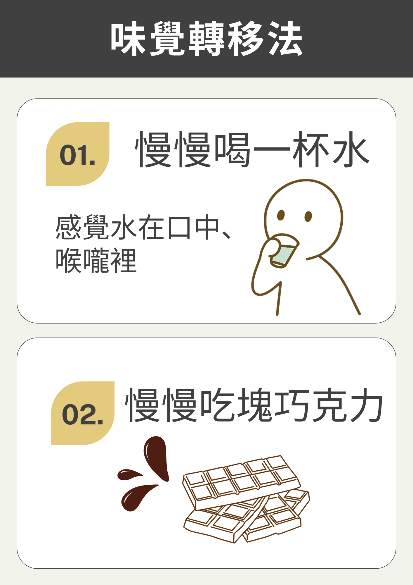 抽卡片(示範): 隨手抽一張策略卡。例如抽到【味覺】,就去喝一杯冷水;抽到【動覺】,就去用力洗個臉或做伸展操。
